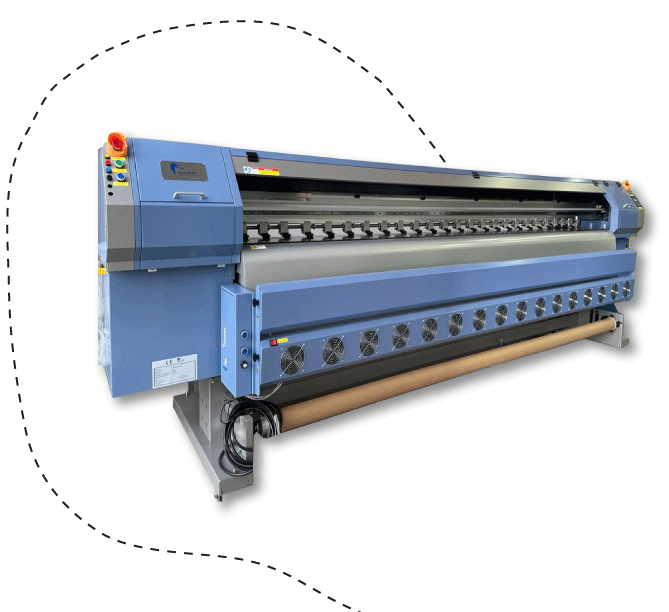 Contamos con 4 equipos Impresora de Gran Formato, con tintas ecosolventes, con una medida 3.2 metros de ancho, hasta 50 metros de largo, que nos permite la impresión de lona, vinil, tela, etc.Se llega a tener una producción de 10,000 lonas de 2 x 1 metros por día.